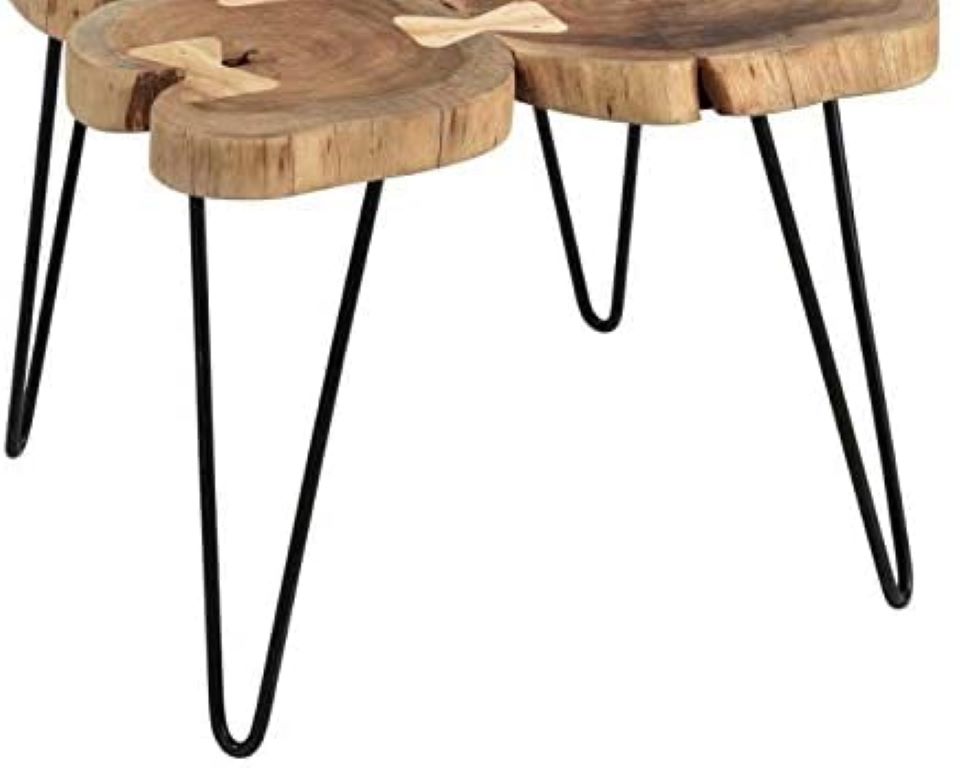 Hochwertige Materialien – Die Tischplatte in Form von 4 Baumscheiben aus Akazienholz hat einen Durchmesser von 60 x 60 cm und eine Stärke von 5 cm. Die Tischbeine aus Metall sind 42 cm hoch, sodass der Beistelltisch eine gesamte Höhe von 47 cm misst. Das Gestell aus pulverbeschichtetem Metall erinnert in seiner filigranen Form an Haarnadeln.